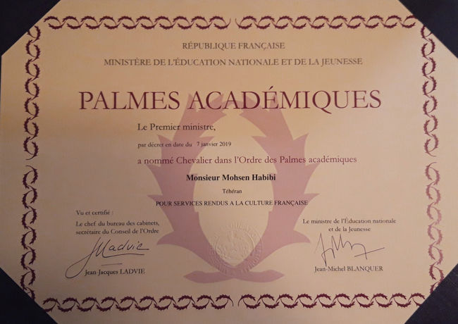 In 2018, Prof. Habibi was also awarded a "titer de Chevalier" in the academic palm department by the French Ministry of Science. In this ceremony which was held in the embassy of France in Tehran, he says: